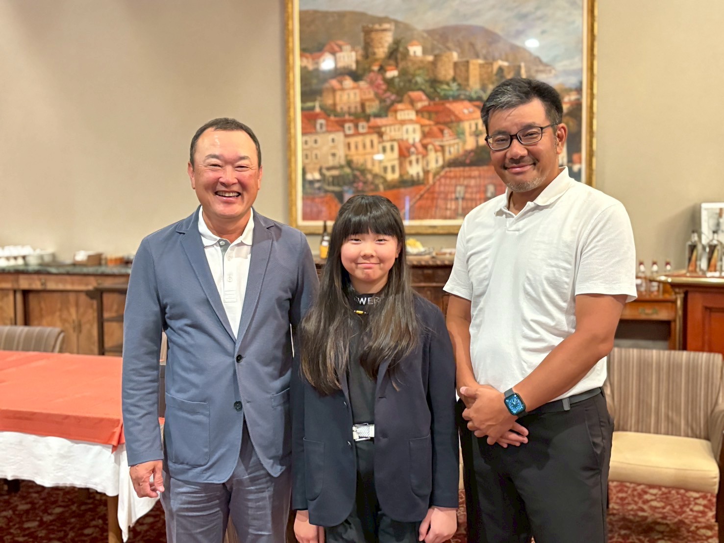 女子ベストグロスの部1位の津止柑那ちゃん(中央)津止克明様(右)皆川会長(左)